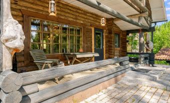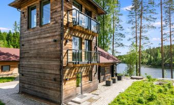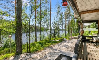 The lakeside sauna has a dressing room and a wood-heated sauna stove. The sauna is a former smoke sauna, and the old smoke stove has been left as a decoration and is not in use. There is a large terrace right by the water.