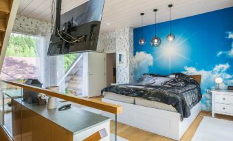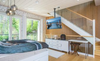 On the upper floor: a hall with a remote workstation, a sofa bed for two as an alternative sleeping place, balcony. Bedroom of 20 m² with a double bed, smart TV, electric curtains, individual room temperature control, glass balcony. The upper floor hall can be accessed from ground floor either via steep stairs or gentler stairs through the upper floor bedroom.