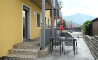 Indoor pool, wellness area and restaurant are located in the Hotel Hirschen (approx. 500 m). Apartment house "Edith", 850 m a.s.l., 3 storeys. 500 m from the centre of Imst, on the outskirts, 62 km from the centre of Innsbruck, in the residential district. For shared use: indoor pool heated (14 x 6 m). In the complex: restaurant, breakfast room, sauna, massage (extra). Storage room for bicycles, storage room for skis, washing machine (extra) (for shared use). Breakfast and half board possible (extra). Shop 500 m, supermarket 1 km, bus stop 10 m, railway station "Imst" 4.5 km, outdoor swimming pool 500 m, natural swimming pond 3 km. Golf course (18 hole) 30 km, cable car 3 km, ski lift 3 km, skisport facilities 3 km, ski bus stop 500 m, ski school 3 km, cross country ski track 500 m. Well-known ski regions can easily be reached: Hoch-Imst 3 km, Hochzeiger 18 km. Well-known lakes can easily be reached: Piburger See 20 km. Please note: the owner lives in the same residence. 1-room apartment 35 m2, on the upper ground floor. Modern and tasteful furnishings: 1 double bedroom. Kitchen-/living room (oven, dishwasher, 4 ceramic glass hob hotplates, toaster, kettle, microwave, electric coffee machine) with dining nook and cable TV (flat screen). Exit to the balcony. Shower/WC. Underfloor heating. Parquet floors. Balcony furniture. Side view of the mountains. Facilities: hair dryer. Internet (WiFi, free). Parking. Maximum 1 pet/ dog allowed. The indoor pool, wellness area and restaurant are located in the Hotel Hirschen (approx. 500m).