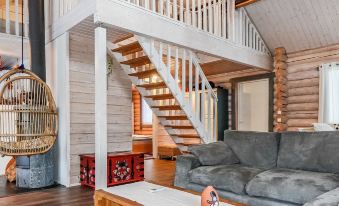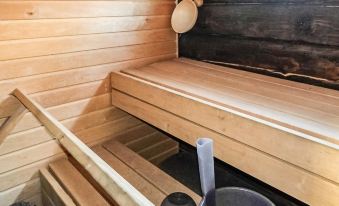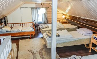 Sofa (not spreadable) in the living room/kitchen, double bed (width 140 cm) in the bedroom, 3 box springs beds 2 mattresses in the loft, sauna, washroom, separate WC and small open terrace.