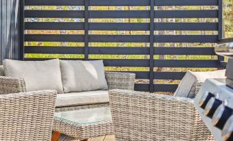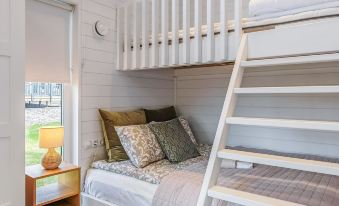 The villa has a unified living room and open-plan kitchen, with access to a spacious terrace. It features an air source heat pump, a bedroom with a bunk bed (lower bed 140x200 cm, upper bed 90x200 cm), and a low loft with two beds. The loft can be accessed via a movable ladder. The bathroom has a shower, WC, and washing machine (the villa does not have its own sauna). The spacious terrace is furnished with high-quality garden furniture, a gas grill, and a sunshade.