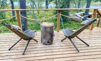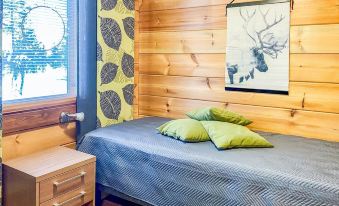 Half of (= apartment in) semi-detached log unit, panelled interior, 2008, living room/kitchen, bedroom double bed, bedroom 1 bed, sauna (electric stove), washroom (2 showers). Upstairs: sofa bed for 1-2 persons, sleeping alcove 2 beds, WC also upstairs, balcony, open porch. Holiday apartment on slope of Levitunturi in Utsuvaara area. Spectacular views towards Levitunturi and the surrounding scenery.