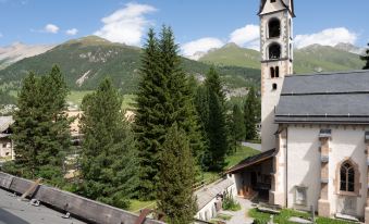 La Punt Chamues-ch 14 km from St. Moritz: The house is right next to the village church, whose bells ring every hour. Apartment house "Chesa Cantieni". On the outskirts, in a sunny position, 14 km from the lake. In the house: storage room for skis, central heating system, washing machine, tumble dryer (for shared use). Communal covered parking at 150 m. Shop 950 m, grocery 950 m, restaurant 400 m, bakery 950 m, café 400 m, bicycle rental 550 m, bus stop "Chamues-ch, plaz" 120 m, railway station "La Punt-Chamues-ch" 1.2 km, indoor swimming pool 15 km, lake St. Moritzer See 14 km. Golf course (18 hole) 5 km, surf school 20 km, indoor tennis centre 16 km, minigolf 16 km, riding stable 1.2 km, walking paths from the house 400 m, cycle lane, cable car 11 km, ski lift 6 km, ski rental 550 m, ski school 6 km, children's ski school 600 m, sled run 6 km, cross country ski track 400 m, ice rink 650 m, children's playground 1.2 km. Nearby attractions: Caferama Badilatti in Zuoz 5 km, Nationalparkzentrum in Zernez 21 km. Well-known ski regions can easily be reached: Zuoz Familienskigebiet 6 km, Corviglia - Piz Nair 15 km, Diavolezza - Lagalb 25 km. Well-known lakes can easily be reached: St. Moritzer See 14 km, Silvaplaner See 20 km, Silser See 25 km. Hiking paths: Albula Pass - SAC Es-cha Hütte, Schweizer Nationalpark / Val Trupchun, Muottas Muragl. Please note: no lift. "Chesa Cantieni", 3-room apartment 85 m2 on 2 levels, north facing position. Comfortable and tasteful furnishings: living/dining room with open-hearth fireplace and TV. 1 room with 1 bed (90 cm, length 200 cm), 1 x 2 bunk beds (85 cm, length 185 cm). Open kitchen (oven, dishwasher, 4 induction hot plates, toaster, kettle, freezer, electric coffee machine, Capsules for coffee machine (Nespresso) extra, raclette grill). Shower/WC. Upper floor: 1 room with 1 double bed (2 x 80 cm, length 195 cm), bath/shower/WC. Exit to the balcony. Gallery with 1 sofabed (150 cm, length 200 cm). Small balcony. View of the resort. Facilities: hair dryer. Internet (WiFi, free). Garage space n 12 at 100 m, height 225 cm, width 260 cm. Please note: suitable for families. Non-smokers only. Instead of an enclosed bedroom, some sleeping areas are located in an open-plan area (gallery, alcove, etc.).
