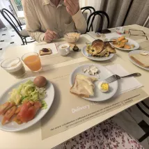 Aamiaiset ovat todella keskinkertaisia, mutta syödä voi, eikä nälkä jää: leivonnaisia, muroja, hilloja, paahtoleipää, makkaraa, juustoa, joitakin vihanneksia, teetä, kahvia, mehuja.