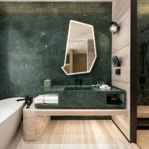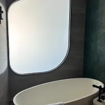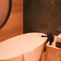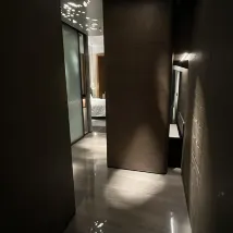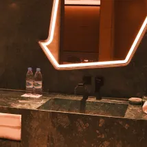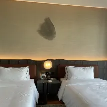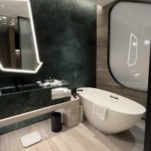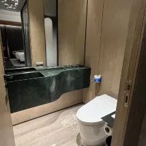 Huone on paljon suurempi kuin muut saman tason hotellit, ja lattiakorkeus on erittäin korkea, mikä saa tilan tuntumaan suuremmalta. Asettelu on myös yksinkertainen ja tyylikäs, mutta silti ainutlaatuinen. Varsinkin tummanvihreä marmorinen työtaso, joka näyttää yhtä salaperäiseltä ja syvältä kuin meressä valon ja varjon alla. Ikkunakehyksessä on myös hieman epäsäännöllinen muotoilu, joka tuo mieleen kuplia meressä joukkue on ollut erittäin varovainen.